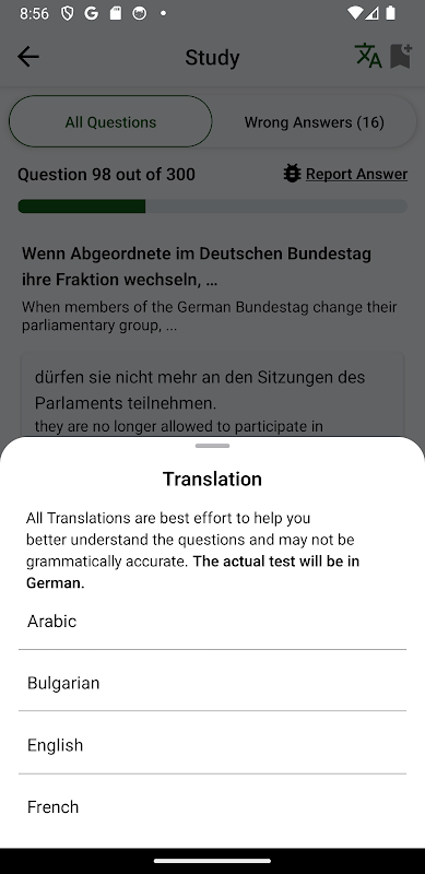 Aplikasi percuma ini adalah teman utama anda untuk mendapatkan ujian kewarganegaraan Jerman. Direka bentuk untuk membantu anda berjaya, ia merangkumi semua yang anda perlu ketahui tentang kehidupan, masyarakat, peraturan dan undang-undang di Jerman, bersama-sama dengan soalan khusus tentang negeri kediaman anda. Ujian ini terdiri daripada 33 soalan aneka pilihan, dengan pemasa 30 minit dan memerlukan sekurang-kurangnya 17 jawapan yang betul untuk lulus.
