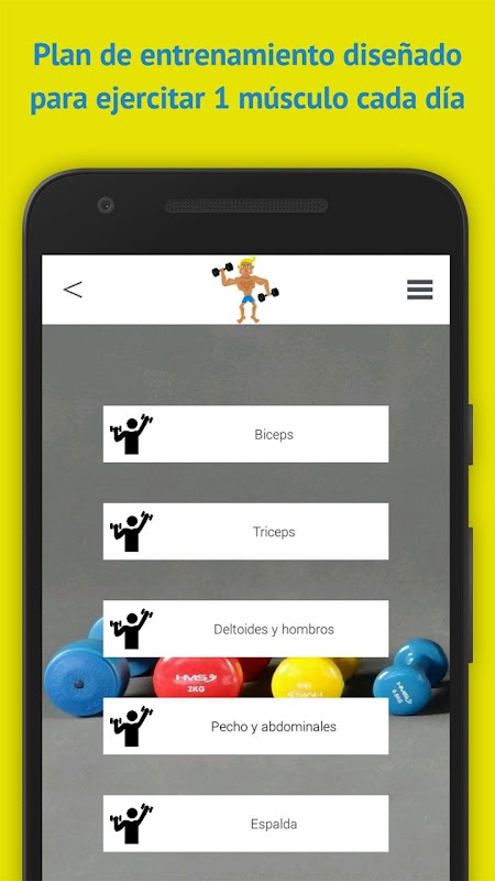Para poder seguir las distintas tablas de ejercicios incluidas en la aplicación le recomendamos adquiera un juego de mancuernas de 4 ó 5 kilos para los hombres y de 3 ó 4 Kg para las mujeres dependiendo de la complexión, estado físico y edad de cada persona.