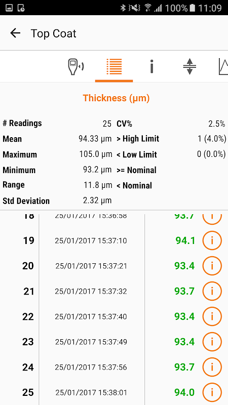 Pemindahan data dari pemeriksaan Elcometer Bluetooth mengukur untuk peranti Android.