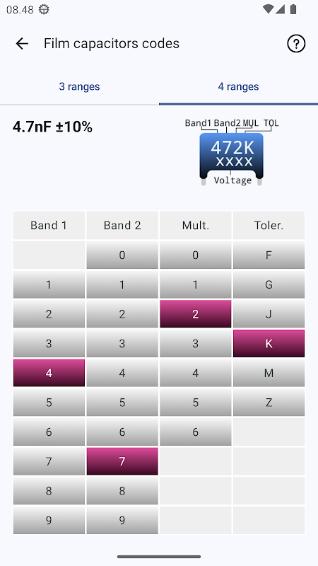 Apl ini juga termasuk bahagian bantuan terperinci dan penjelasan untuk semua kod yang disokong, bersama-sama dengan carta nilai siri E standard.