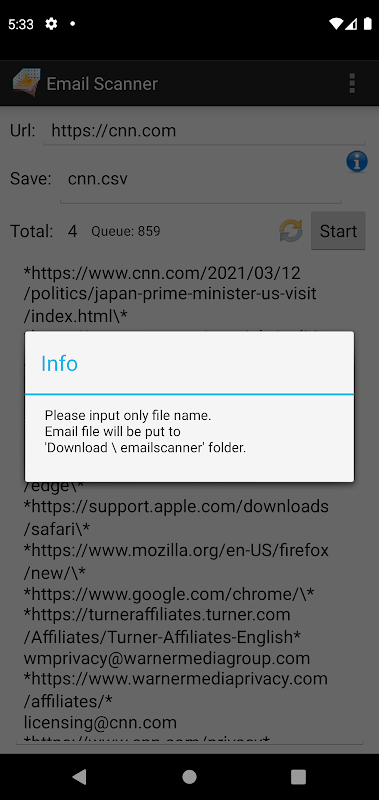 Ekstrak alamat e-mel dari laman web. Yang anda perlukan adalah memasukkan laman web permulaan anda ke aplikasi pengimbas e-mel, aplikasi akan meminta semua pautan yang berkaitan dan mengekstrak e-mel dari pautan tersebut.