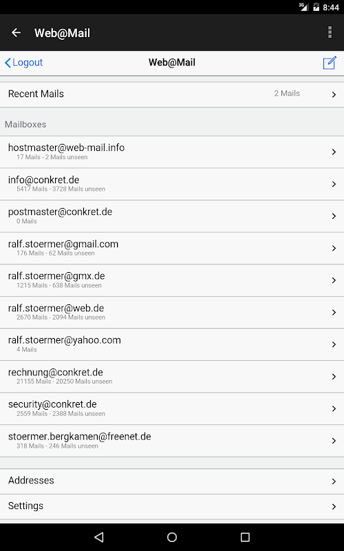 Web @ Mail adalah perkhidmatan mel selamat, bebas dan bebas iklan berdasarkan HTML5 (yang boleh anda gunakan dengan penyemak imbas di mana-mana peranti - lihat: https://conkret.mobi). Ia menawarkan keselamatan dan akses langsung ke peti surat mana pun tanpa usaha pemasangan dan tanpa penyegerakan data yang melkan kotak surat dengan bekerja secara langsung dengan pelayan anda - jadi anda tidak perlu mengubah rekod MX untuk domain anda.