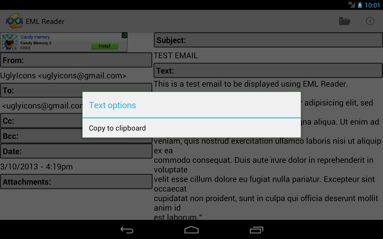 Anda boleh membuka fail EML atau MSG daripada mana-mana sumber. Tekan lama pada mana-mana medan untuk melihat menu konteks.