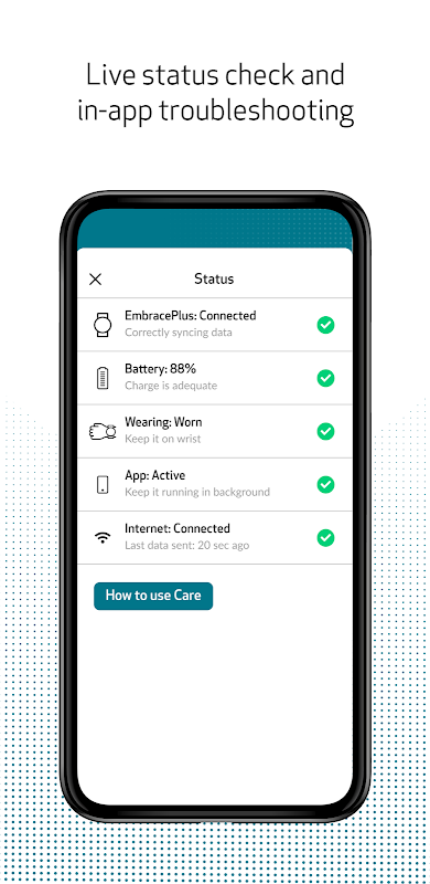 Apl Penjagaan digunakan oleh pesakit dan peserta percubaan untuk memudahkan pengumpulan data kesihatan jauh apabila digunakan dengan EmbracePlus gred perubatan Empatica yang boleh dipakai. Apl Penjagaan menerima data fisiologi yang dikumpul oleh EmbracePlus melalui Bluetooth dan menghantar data ini ke Cloud untuk semakan dan muat turun oleh profesional.