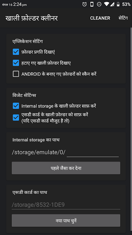 Catatan: folder dengan ".nomedia" dan fail tersembunyi lain tidak akan dihapuskan kerana mungkin diperlukan oleh sistem atau aplikasi yang membuatnya. Pembangun tidak bertanggungjawab atas masalah yang dibuat oleh aplikasi ini. Anda menggunakan aplikasi dengan risiko anda sendiri.