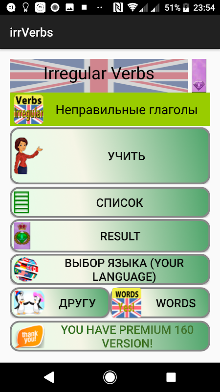 Aplikasi ini adalah percuma, tetapi jika anda suka dan akan berguna untuk jumlah nominal anda boleh memuat turun versi tanpa iklan. Dengan cara ini, melalui semua 8 kumpulan, pengetahuan anda kata kerja yang tidak teratur. akan menjadi lebih baik daripada sebuah sekolah khas siswazah dengan bahasa Inggeris. Dan ia akan memerlukan beberapa jam dan beberapa pendekatan yang. kejayaan akademik!