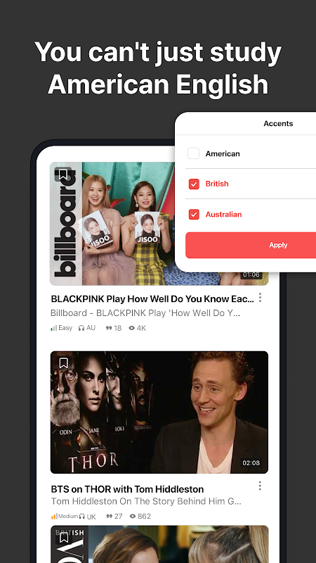 Anda tidak perlu mengalah. Berseronoklah! Pilih daripada rancangan TV, filem, animasi, Berita BBC, wawancara selebriti dan banyak lagi. Kami telah menyediakan segala-galanya untuk anda belajar. Belajar bahasa Inggeris tanpa disedari dengan menonton video kegemaran anda. Adakah video yang ingin anda pelajari tidak tersedia? Minta kepada Pasukan RedKiwi! (Awas! Anda mungkin berjaga sepanjang malam untuk belajar)