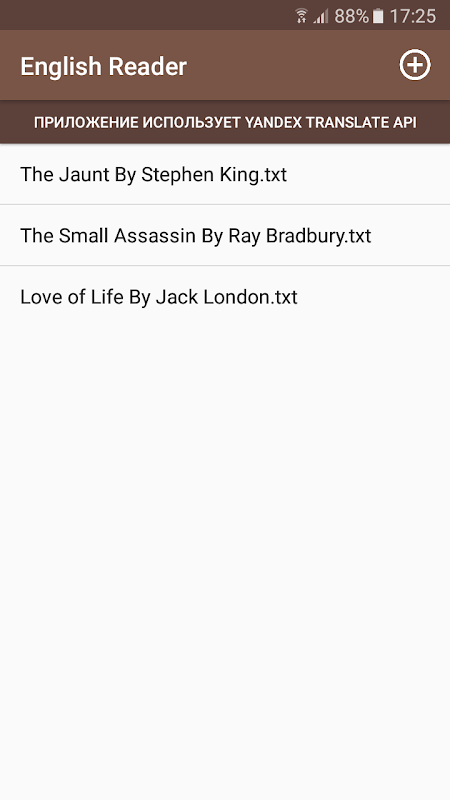 Приложение позволяет читать книги на английском языке. Достаточно кликнуть по незнакомому слову, чтобы узнать перевод. Пока поддерживается только один язык и только один формат текста - txt. Это будет исправляться в ближайших обновлениях, а пока можно воспользоваться любым онлайн конвертатором, если Ваш текстовый файл имеет другой формат.