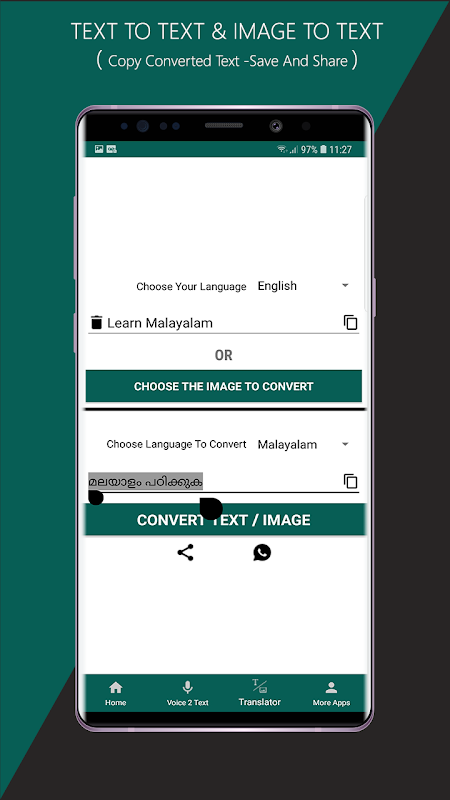 Easy way to Translate your voice / speech to text and image to text into Malayalam Language and translate English to Malayalam using English to Malayalam Voice + Image Text Translator with a click of a button.Forget about installing additional Malayalam keyboard to type words or to translate English to Malayalam To chat on WhatsApp,Facebook or an email.Press the mic button to speak and this app will translate your speech to the text.Pick an image from gallery or using camera or any gallery apps or photo apps and convert to Malayalam instantly.Also use Text translator to translate English to Malayalam or Vice Versa.