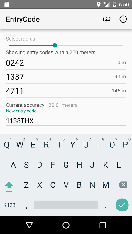 The app shows your nearby entry codes in a list. To see entry codes from locations further away, move the slider right. To narrow the search, move the slider left.
