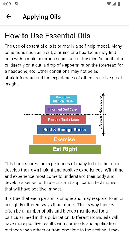 Ensiklopedia maklumat mengenai minyak pati, menggabungkan dan permohonan mereka untuk manfaat kesihatan. Kandungan utama adalah senarai lebih 350 masalah kesihatan dan dimasukkan dengan mereka adalah penerangan ringkas mengenai masalah kesihatan, apa minyak pati dicadangkan, bagaimana untuk memohon mereka dan pengalaman orang lain mempunyai. Selain daripada ini terdapat adalah termasuk gambaran keseluruhan apa minyak pati dan di mana mereka datang dari, ringkasan bagaimana minyak pati digunakan, glosari istilah yang berkaitan dengan minyak pati untuk mereka yang baru kepada penggunaan dan maklumat mereka mengenai cara untuk menggunakan minyak pati dengan selamat .