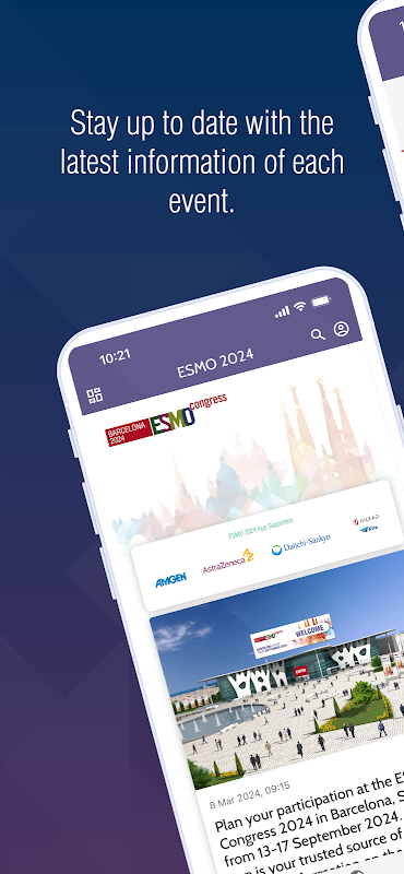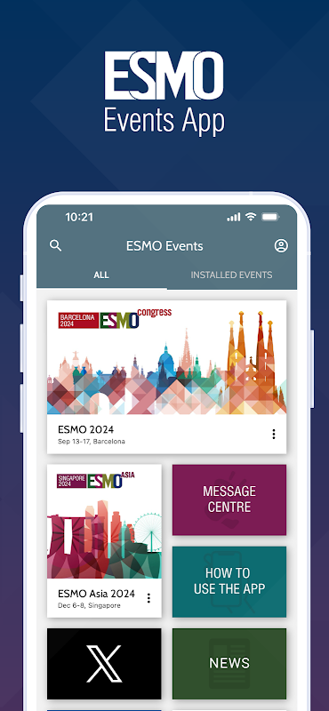 ESMO Multi-acara App adalah aplikasi perpustakaan acara yang menyenaraikan semua persidangan ESMO ini. Hanya memuat turun aplikasi dan pilih Persidangan ESMO anda berminat untuk. ESMO akan selalu menambah persidangan baru ke dalam senarai, jadi jangan memadam app! Terima kasih kepada aplikasi ini, anda akan dapat untuk melayari program saintifik yang lengkap dengan hari, topik, jenis kanser dan trek, dan mewujudkan program peribadi anda sendiri. Mencari bilik pameran dan berdiri di atas floorplans, menerima berita harian dan banyak lagi. Sebelum penggunaan pertama, anda akan perlu untuk memuat turun data persidangan terkini dan selepas itu, anda boleh menggunakan aplikasi luar talian, walaupun kemas kini akan disediakan sebelum setiap Kongres.