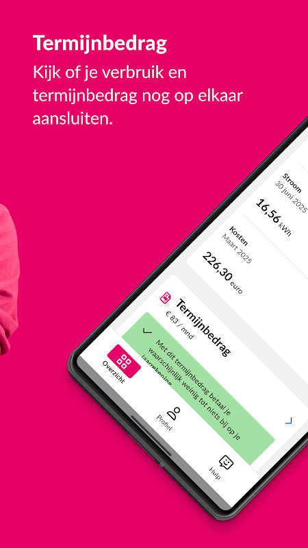 Anda boleh mengatur sendiri semua urusan tenaga anda dalam apl Essent. Semak penggunaan anda dan laraskan jumlah ansuran anda jika perlu. Dengan cara ini anda mengawal kos anda. Dan adakah anda mempunyai sebarang soalan? Tanya mereka terus ke chatbot kami Robin.