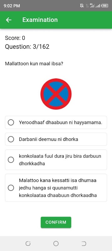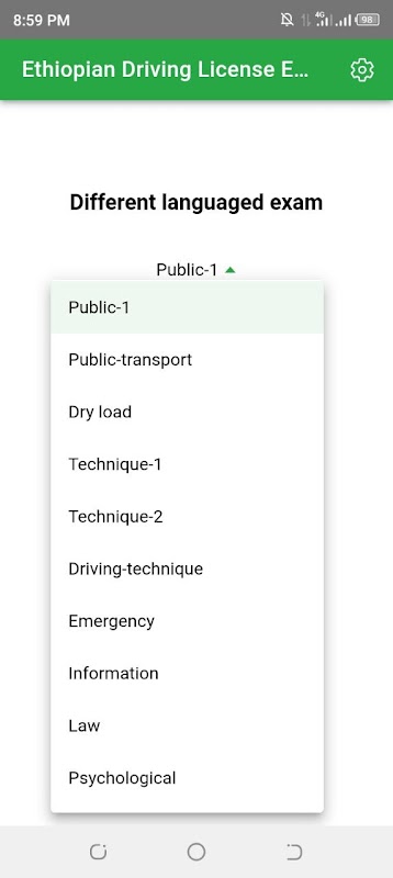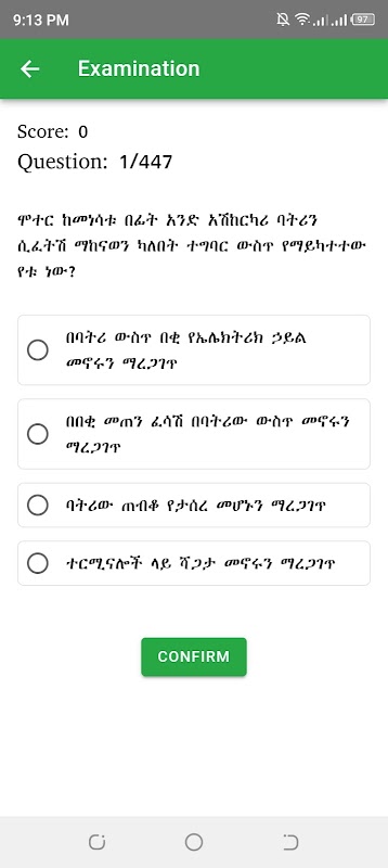 Aplikasi ujian lesen memandu pelbagai pilihan pertama merangkumi pilihan dwibahasa dalam Amharic dan Afan Oromo dengan lebih daripada 3,000 soalan dan jawapan dalam 10 kategori berbeza: Public-1, Transportasi Umum, Beban Kering, Teknik Memandu, Maklumat dan juga Undang-undang Memandu, Psikologi dan banyak lagi Soalan dan jawapan yang disediakan dengan teliti untuk sesiapa sahaja yang mencari pengetahuan dalam bidang khas ini.