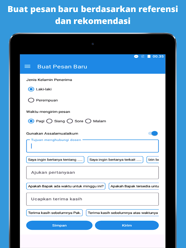 Referensi Pesan : Aplikasi ini menyediakan berbagai referensi pesan yang bisa disesuaikan dengan kebutuhan mahasiswa. Referensi ini mencakup berbagai situasi umum, seperti permohonan izin dan pengajuan bimbingan.