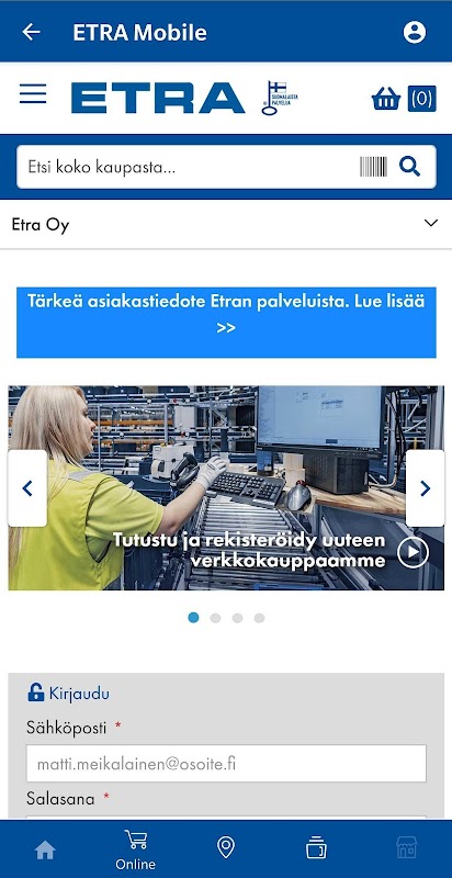 Etra Mobile adalah aplikasi mudah alih untuk pelanggan akaun Etra, dengan mana anda dapat dengan mudah membuat pesanan pengisian di gudang Etel's Shelving Service dan merekod transaksi pengambilan dari Etra's Trading Warehouses.