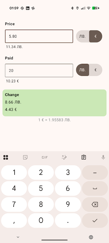 Anda boleh mengira harga dalam Leva dan Euro, mengira pembayaran anda dalam Leva dan Euro dan mengira perubahan anda dalam Leva dan Euro