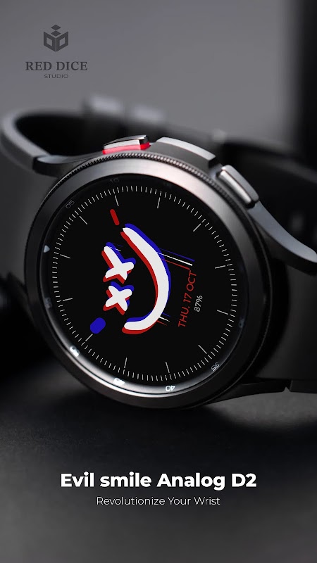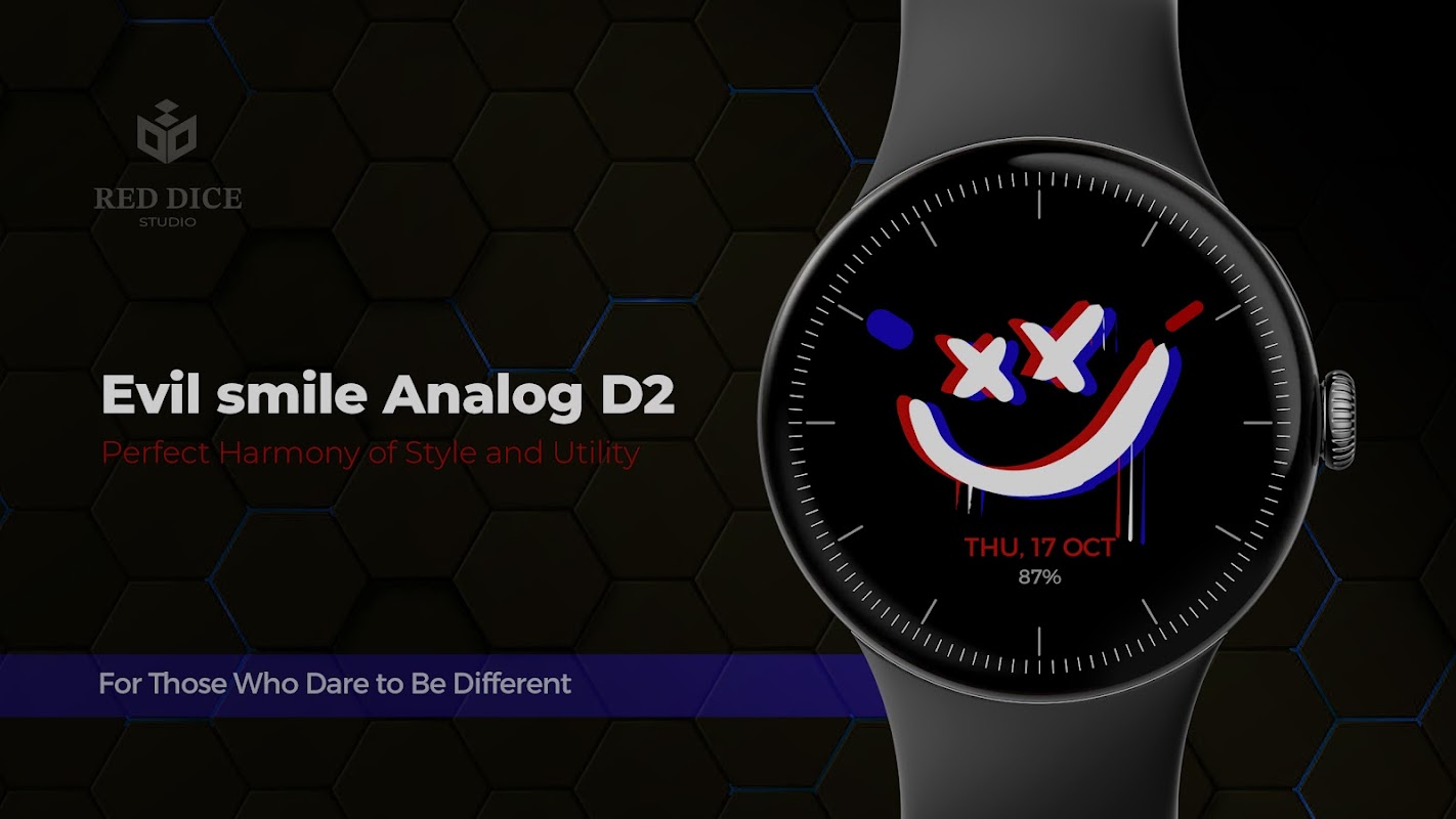 Lepaskan sisi edgy anda dengan Evil Smile Analog D2, muka jam yang berani dan artistik yang direka untuk menonjol. Menampilkan grafik "senyuman jahat" yang menarik dengan aksen merah dan biru yang terang, reka bentuk unik ini menggabungkan kreativiti dan ekspresi dengan jam analog yang anggun untuk jam tangan pintar anda.