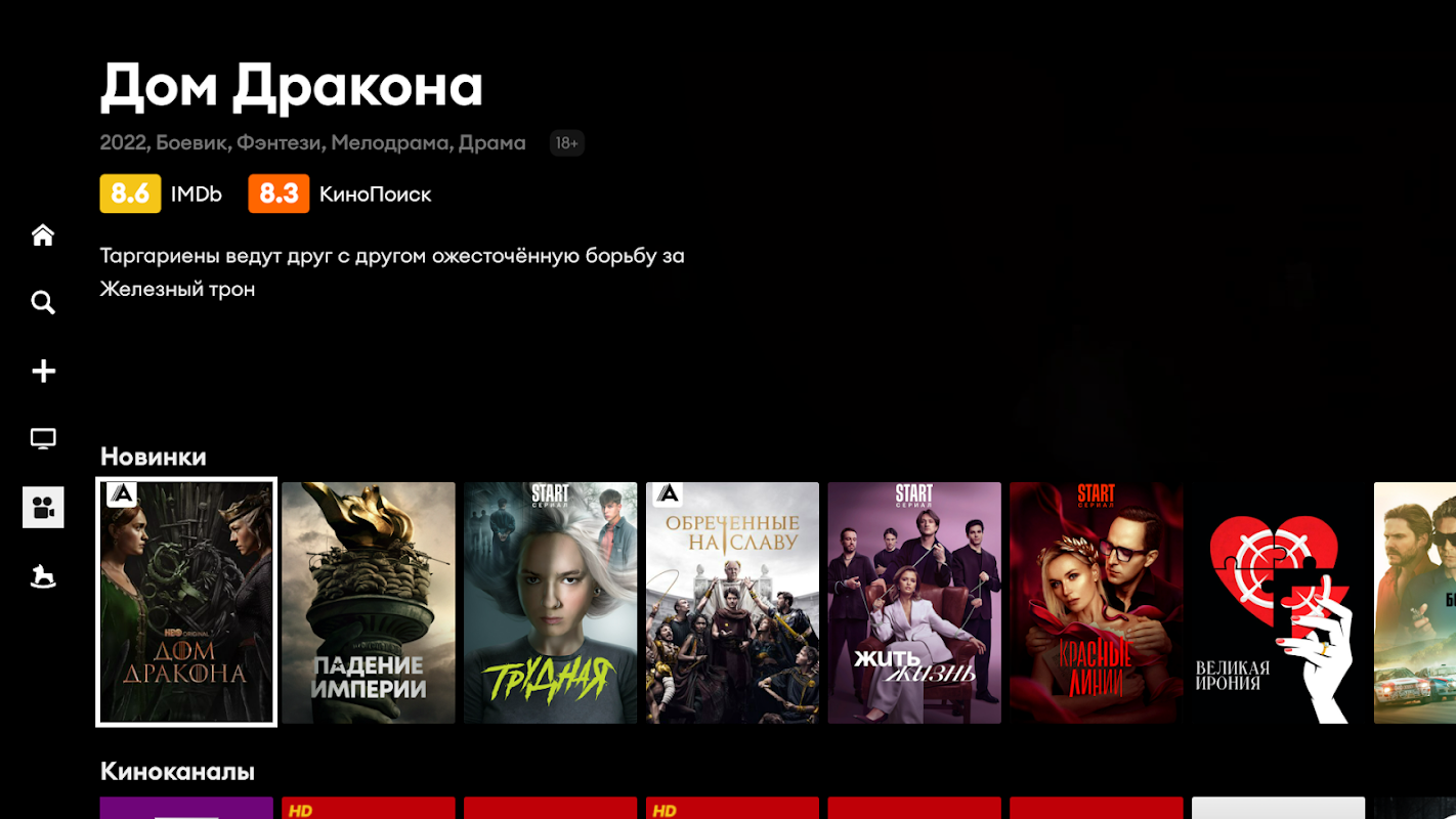 • Lebih daripada 400 saluran: Saluran Satu, TNT, STS, TVC, Karusel, Match TV, STS kids, Disney, 1TV HD dan ratusan yang lain. Panduan program 7 hari terbina dalam dan saluran digital percuma.