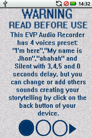Ini EVP Perakam Audio mempunyai 4 suara pratetap: "Saya di sini", "Nama saya Jhon", "ahahah" dan senyap dengan 3,4,0 dan 5 saat kelewatan, tetapi anda boleh mengubah atau menambah bunyi lain yang mewujudkan cerita anda klik pada butang belakang anda