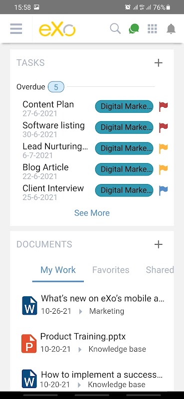 Apl mudah alih eXo Platform adalah berdasarkan reka bentuk yang ringkas dan intuitif, apl itu membolehkan pasukan anda mengakses tempat kerja digital mereka, dimaklumkan tentang perkara penting dan mengakses semua ciri platform di mana sahaja mereka berada.