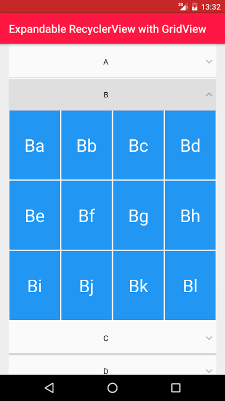 This app is a demonstration for implementing an Expandable RecyclerView with group items that can be individually expanded to show its children in a two-dimensional scrolling grid.