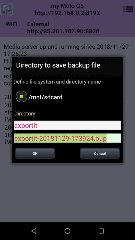 Pelayan HTTP boleh digunakan melalui Internet dari rangkaian WiFi anda hanya mengkonfigurasi nombor port luaran dalam konfigurasi. Sekiranya nilai bukan sifar diberikan, aplikasi cuba mengkonfigurasi Gateway Internet anda secara dinamik oleh UPnP, jika tidak, anda mesti mengkonfigurasikan secara manual.
