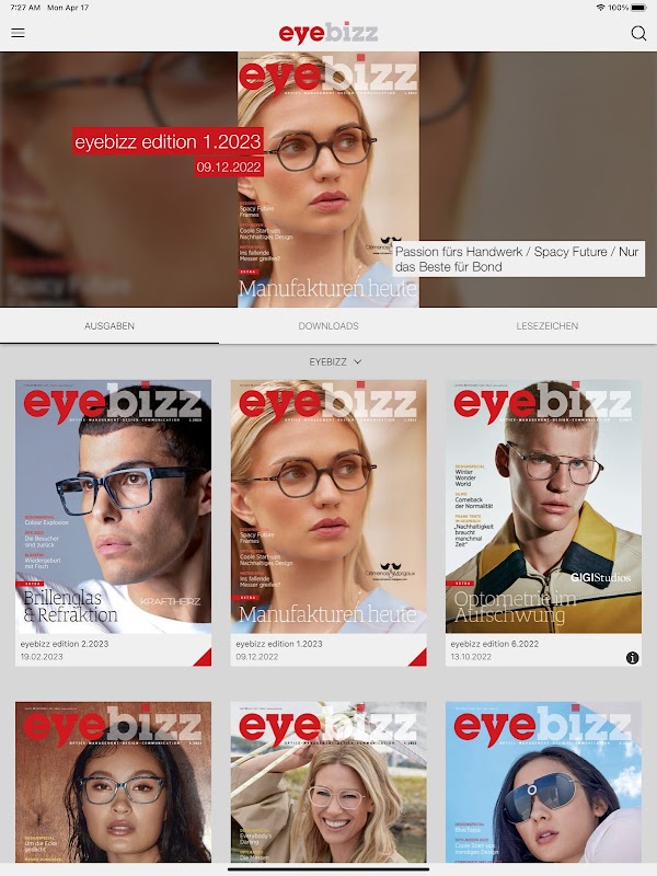 Aplikasi eyebizz menghubungkan majalah bercetak berkualiti tinggi kami dengan alam semesta dalam talian. Kami menggabungkan multimedia: artikel, iklan, iklan, mis. B. dengan video, laman web, podcast atau muat turun. Aplikasi dan arkib baru kami bebas dari peranti, bebas penghalang, tersedia 24/7, mudah, fungsi carian, saiz fon boleh disesuaikan. Alami cara baru untuk menangani pembaca dengan eyebizz.