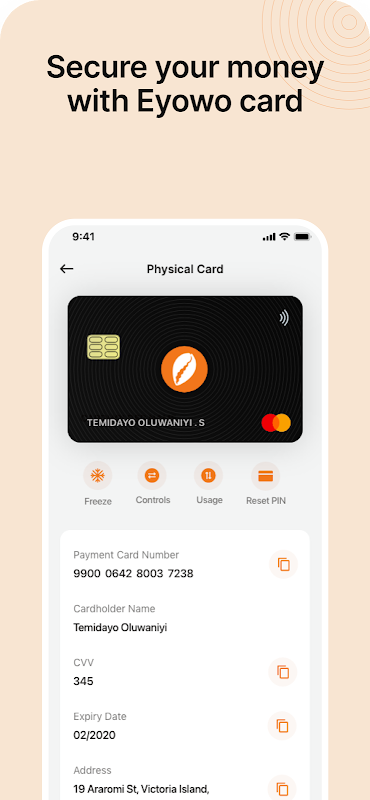 Dengan kad Eyowo, kami telah mengalih keluar semua maklumat yang boleh digunakan oleh penipu untuk mencuri wang anda. Maklumat kad anda kini berada dalam apl anda. Ini adalah kad paling selamat di Nigeria.