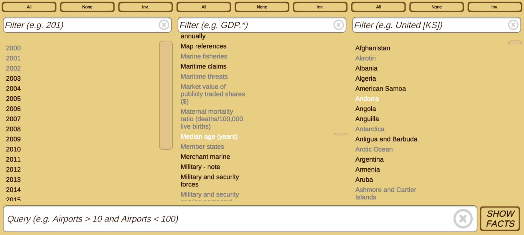 Pilih satu atau lebih item daripada tiga senarai (tahun, kategori, negara) dan tekan 'Tunjukkan Buku Fakta'.