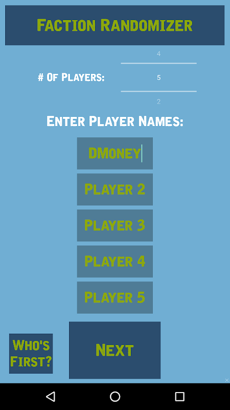This is a very easy to use app that will give you a random faction to use in your Smash Up game. You can select 2-5 players, give them names if you want, and see who goes first! You can select which Smash Up expansions you will be using for each game. All currently available Smash Up expansions are included (through the It's Your Fault expansion)!! There's even options to receive 2nd factions and 3rd factions if you want to get 3 and choose 2 to use.
