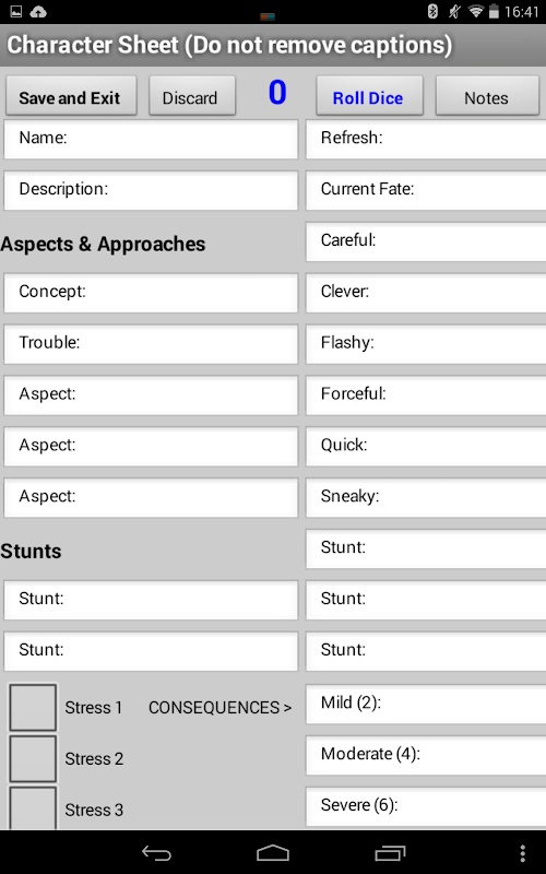 The text boxes have to be small to try to fit an entire character sheet into a phone screen size so a notes page is provided for each character sheet for recording extra detail about Description, High Concept, Stunts etc. This has buttons for adding stunt template text.