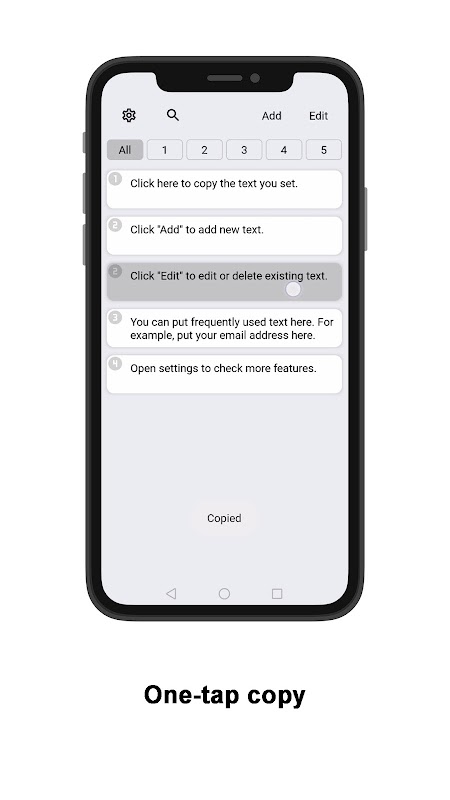 Anda boleh menambah teks dalam apl dan menyalinnya ke papan keratan setiap kali anda memerlukannya tanpa menaipnya berulang kali. Selain itu, anda sentiasa boleh menambah/mengedit teks dan menetapkannya dengan teg tertentu.