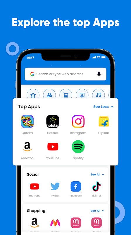Semak imbas apl Beli-belah: Apl ini juga membenarkan pengguna menyemak imbas apl beli-belah seperti Amazon, Flipkart, Myntra, Snapdeal, Ajio, Limeroad, Shopclues dan TataCliq. Ciri ini boleh membantu pengguna menyemak imbas dan membeli-belah dengan selamat dan persendirian.