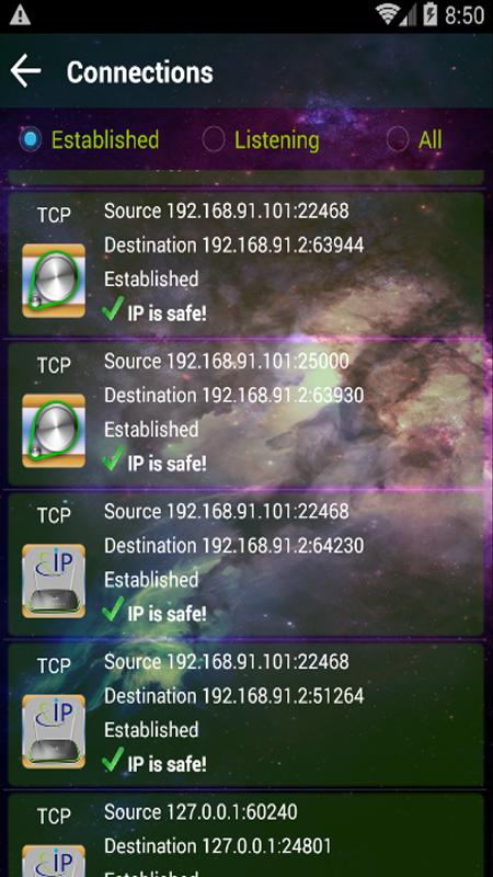 -Displays ALL connections that are currently connected through your device. It displays established foreign connections, listening IP interfaces, and closed connections. Each established IP is checked against 35 blacklist databases to determine if the IPs are trusted or known threats! Blacklist IPs can cause your internet speeds to be slower too.
