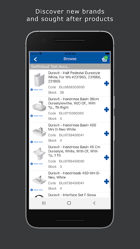 Setelah didaftarkan, anda boleh melihat senarai produk kami atau mencari produk mengikut kod produk, dengan keterangan atau dengan mengimbas kod bar dengan kamera peranti anda. Lihat dengan cepat dan mudah ketersediaan senarai stok kami, buat pesanan dan terima promosi dan potongan harga khas, semuanya dari telefon pintar atau tablet anda.