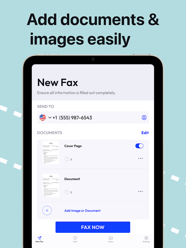 Tukar peranti anda menjadi mesin faks! Imbas dokumen dengan kamera dan hantar faks ke seluruh dunia.