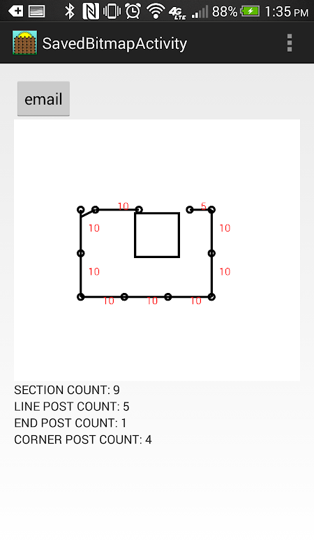 The app keeps track of how many end posts, corner posts, sections, and line posts you have added. Once you are complete with a fence diagram, you can "save" it by clicking the save button. It will create an image of the diagram, and you will be able to email it to yourself, or a fence company for installation material requirements, or an estimation. This app does not take into account materials themselves, such as wood or vinyl, it just creates a diagram for you. You can decide the materials later.