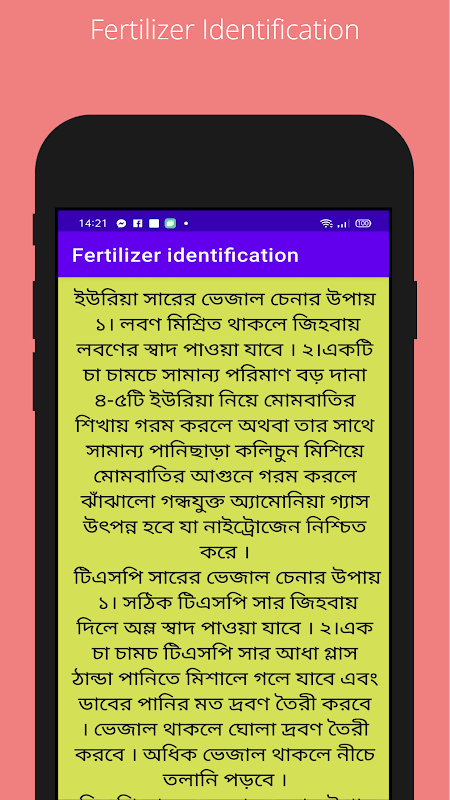Fertilizer Identification is a tools app for identification of some chemical fertilizers. With the App anybody can detect original form of Urea, TSP, DAP, MOP, Gypsum, Boron, Zinc fertilizers. Simple test are discussed in the App. Very low cost available method are used to find out original fertilizers. There are only 3 screen in app. 7 buttons are used in app .First 4 button click for screen2 and next 3 button for screen 3 .language used in app Bangla. Farmers can easily use it in Bangladesh and India. The APP can be helpful for fertilizer users .