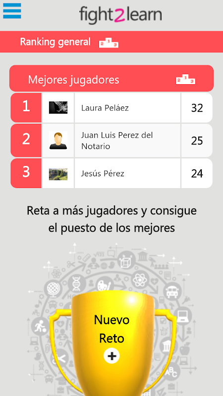 Fight2Learn adalah soalan dan jawapan permainan di mana anda mempunyai had masa untuk mencabar pemain lain dan menjadi pemenang.