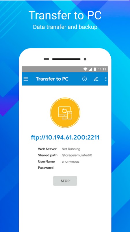 • Access from PC : You can access your android device storage from PC to manage files on your local android device using FTP(File Transfer Protocol).