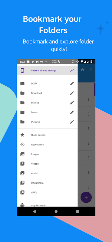 Desain material dan UX sederhananya memungkinkan Anda menjelajahi file dan aplikasi dengan sangat mudah. dengan es file manager Anda juga dapat mengakses file dan folder perangkat Anda di komputer dan telepon lain menggunakan Server FTP.