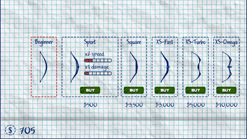Untuk anak panah yang tidak terpakai Anda akan mendapatkan uang tunai permainan. Menggunakan uang untuk membeli busur lebih keren dan kuat.