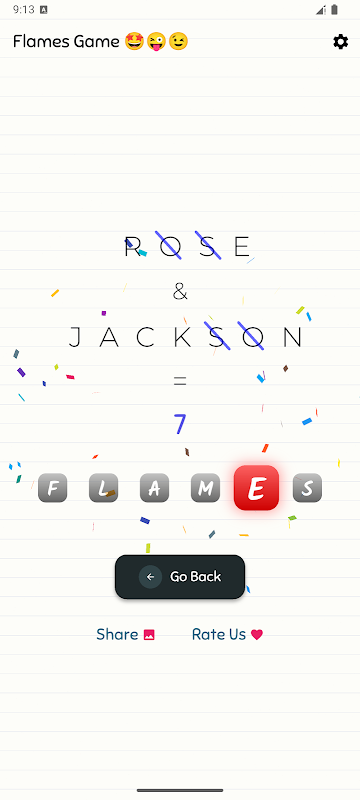 Ini ialah permainan klasik yang menyeronokkan yang dipanggil FLAMES yang dimainkan menggunakan dua nama.