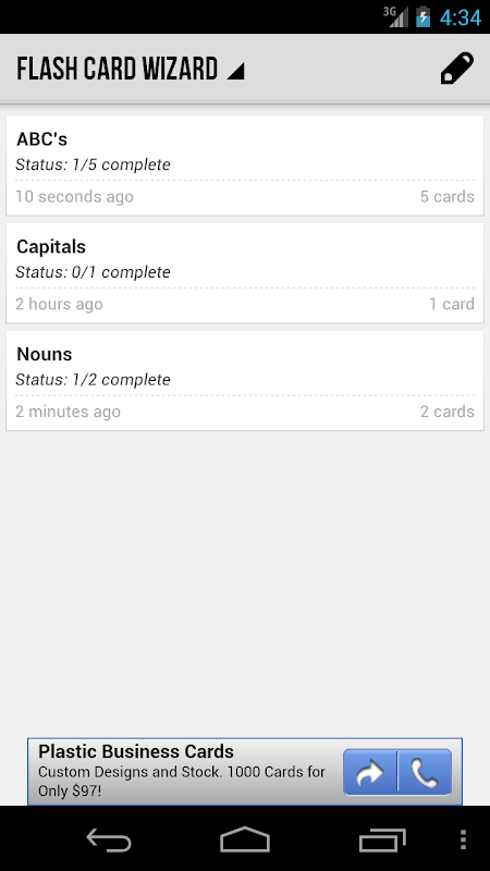 To begin, first create a new deck of cards by hitting the pencil icon in the upper right of the title bar. Next, be sure to give the deck a meaningful name for easy reference. You can edit and delete decks via long pressing on them. Once the deck is created you can begin making cards.