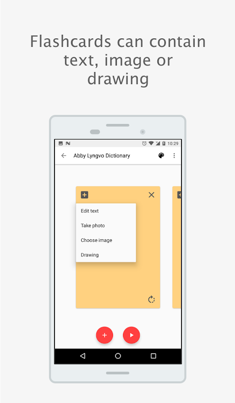 Flashcards boleh diedit dalam kedua-dua cara. Hanya flip mana-mana kad flash dan menambah imej, teks atau lukisan!