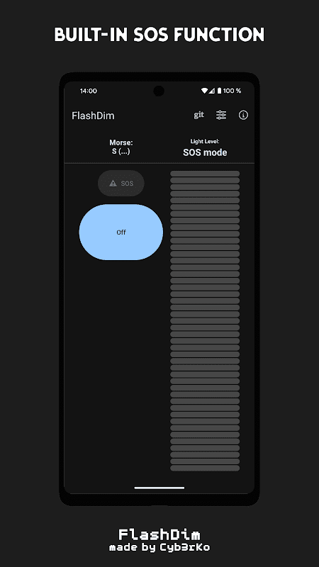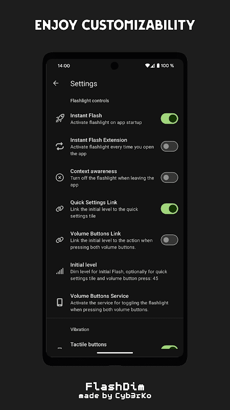 Untuk menawarkan kefungsian untuk menogol lampu suluh menggunakan butang kelantangan FlashDim menggunakan perkhidmatan kebolehaksesan. Ia dapat membaca peristiwa penting dan bertindak balas terhadap klik butang kelantangan.