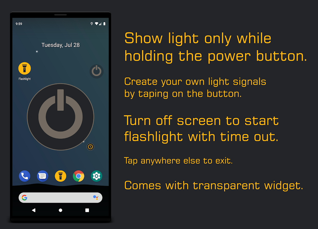 - Turn off screen to start flashlight with timeout.
