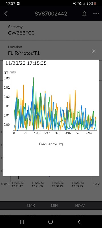 Kesan masalah serius dengan mesin industri lama sebelum kerosakan dapat dilihat untuk mengurangkan masa henti yang tidak dirancang. Gunakan apl FLIR Gateway daripada peranti mudah alih atau PC untuk memantau keadaan peralatan kritikal dengan menganalisis aliran getaran dan suhu daripada penderia FLIR SV87 anda.