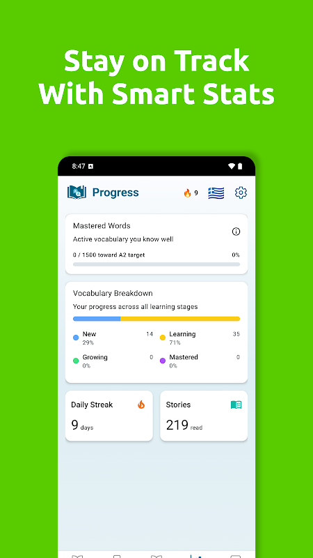 Baca cerita asli yang menyeronokkan yang disesuaikan dengan minat anda dan tahap CEFR (A1–C1). Pilih bahasa anda, pilih topik dan mula membaca. Pembelajaran berasaskan konteks membantu anda mengingati perkataan baharu dengan lebih cepat dan menggunakannya dalam kehidupan sebenar.